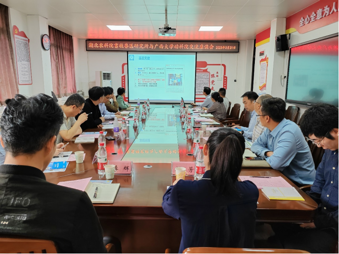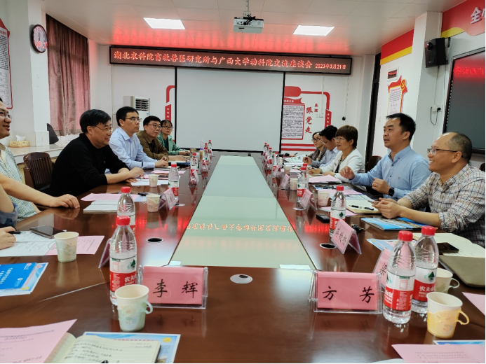 在何副院长介绍完广西大学及英国上市公司365概况之后,副所长毕延震和温国元简要介绍了湖北农科院畜牧兽医研究所的概况、现状及发展。湖北省农科院畜牧兽医研究所成立于1958年,一直致力于畜禽品种选育、畜禽疫病诊断与防控等方面的研究,有瘦肉猪育种、动物营养、兽医等专业研究室6个,建立国家家畜工程技术研究中心、湖北省动物疫苗工程技术研究中心等国家级和省级科研平台8个以及综合试验示范基地1个,形成了养猪、家禽、兽医等优势和特色学科。两位副所长还着重介绍了研究所的人才队伍建设,国家级和省部级科研项目以及经费情况,在科技奖项、畜禽品种培育及论文发表方面的成果,国家级和省级科研平台及院企共建情况,科技创新和成果转化情况、人才结构特点和在人才引培上遇到的问题,强烈希望我院今后输送高水平博士毕业生到研究所就业,并希望与我院开展研究生联合培养。随后,温国元副所长还介绍了兽医研究室的概况和自己在高效新型畜禽耐热活疫苗研究开发上取得的重要成果,吴俊静研究员和陈芳副研究员分别简要介绍了猪育种研究室和动物营养研究室的基础和应用研究状况以及取得的成果。