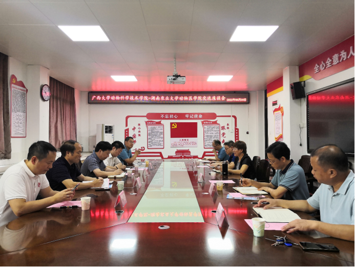 湖南农业大学动物医学院党委书记孙志良、院长郑晓峰、正处级组织员姚文昌、我院党委书记顾慕娴、常务副院长陆阳清、大北农-九鼎饲料产业广西区总裁邓华、广东巨农集团广西区总裁成云飞、我院副院长宁鹏飞、周磊、何家康、韦祖樟参加了本次座谈交流。