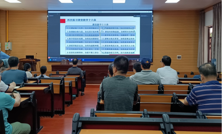 其次,2023年9月19日下午15:00,为做好本科教育教学审核评估专家入校的听课准备工作,学院组织担任本科授课任务的老师到学院318报告厅集中学习,参加教师教学发展中心开展的课堂教学十六条正负面清单视频培训会。