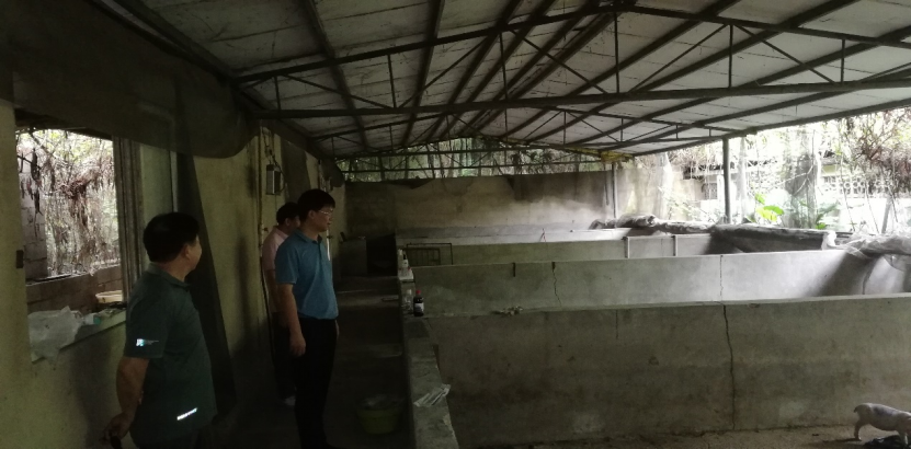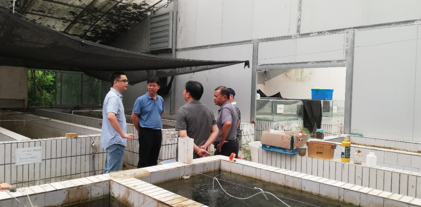 党委书记韦小强(左二)检查学院水产教学科研基地养殖大棚