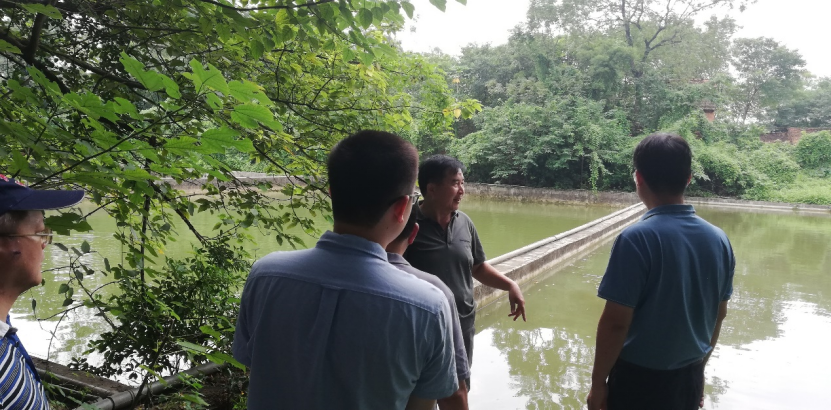 党委书记韦小强(右一)检查学院水产教学科研基地鱼塘