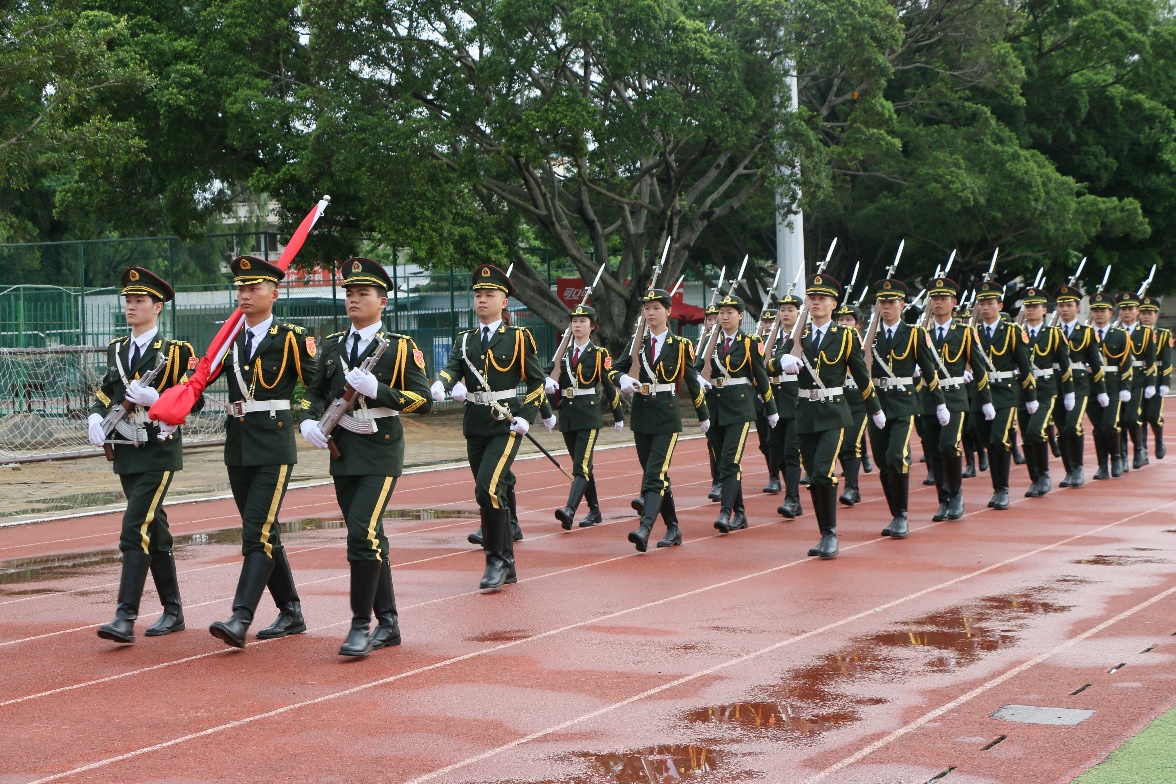 在全场师生的注目下,英姿飒爽的国旗护卫队队员,迈着整齐划一、铿锵有力的步伐,护送鲜艳的五星红旗进场,伴随着雄壮的《义勇军进行曲》,五星红旗在晨光中冉冉升起,迎风飘扬。全体师生庄严肃立,齐唱国歌,向国旗行注目礼。