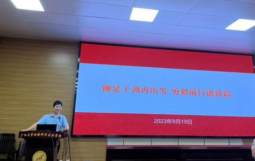 2023年9月19日下午,在学院318报告厅,院党委书记韦小强给全院教职工上题为《铆足干劲再出发,勇毅前行谱新篇》的专题党课。