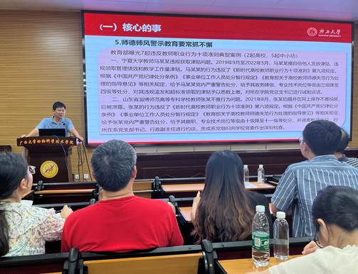 韦小强书记深刻解读习近平总书记重要文章《扎实推动教育强国建设》和习近平总书记给东北大学全体师生回信的重要精神,并结合文章精神,谈学院师德师风建设及开展警示教育的重要性,各学科课程思政建设思路,对新进教职工教学能力培养的要求等。他强调,学院要全力以赴做好“争创全面一流十大工程”各项工作,全院教职工要同心共进,共同做好学院核心的事、发展的事和民生的事。