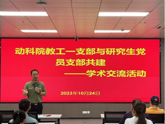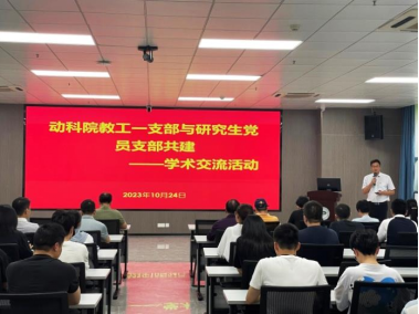 为深入学习贯彻习近平新时代中国特色社会主义思想,促进党建与业务相融合,2023年10月24日下午,我院教工第一党支部与动科系研究生党支部在国重北107室联合开展“支部间学术交流,党建与业务齐精进”主题党日活动。院党委副书记、院长陆阳清同志莅临指导。