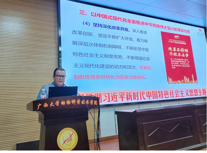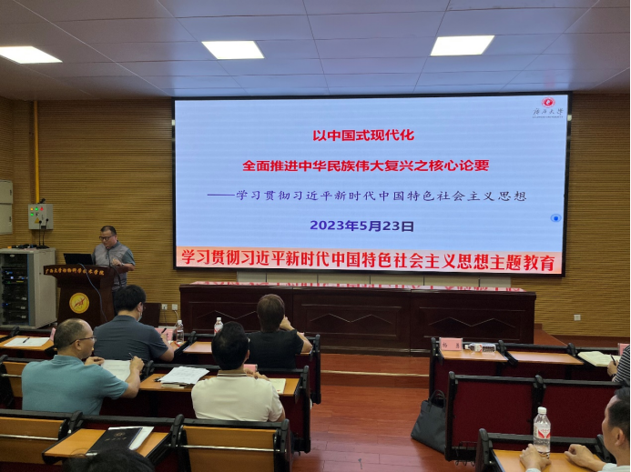 为深入开展学习贯彻习近平新时代中国特色社会主义思想,5月23日下午,我院邀请广西大学马克思主义学院马克思主义中国化方向负责人杨勇教授为我院师生讲授《以中国式现代化全面推进中华民族伟大复兴之核心论要——学习贯彻习近平新时代中国特色社会主义思想》专题党课。
