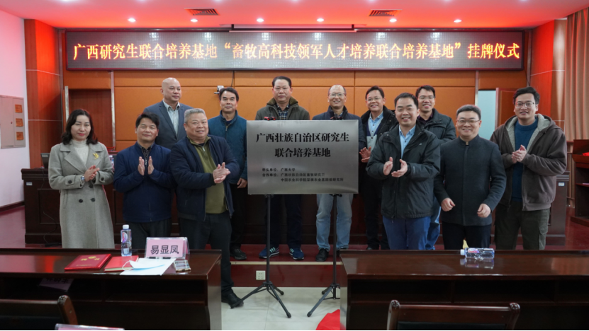 本次活动还举行了广西研究生联合培养基地“畜牧高科技领军人才培养研究生联合培养基地”挂牌仪式。该联合培养基地由广西大学牵头,广西壮族自治区畜牧研究所和中国农业科学院深圳基因组研究所作为合作单位,三方共同合作建设,针对广西现有的经济特点和区位优势,做好对研究生的培养工作,为广西的畜牧业发展建设培养高科技领军人才,引领畜牧业发展。挂牌仪式后双方专家就广西畜牧业发展和人才队伍建设进行了座谈交流。陆阳清教授首先就广西大学英国上市公司365的人才培养优势和项目资源做了相关介绍,广西畜牧研究所所长吴柱月研究员也介绍了广西畜牧研究所的基本情况。双方就利用好优势资源,充分发挥畜牧高科技领军人才培养研究生联合培养基地的作用,实现共赢发展,同时为自治区经济发展贡献力量,助力国家乡村振兴。