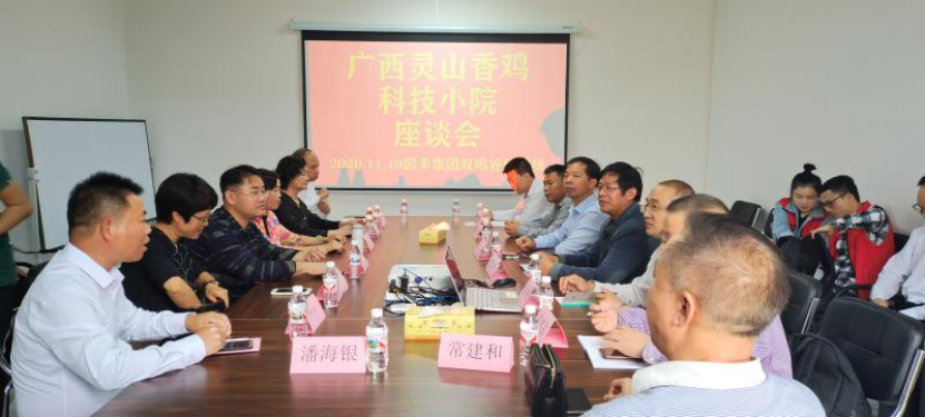 随后召开了科技小院成立以来第一次工作对接交流会。会议上广西园丰牧业集团股份有限公司技术总监等技术骨干根据养殖中所遇到的困难提出疑问,广西大学农牧产业发展研究院邹知明高级畜牧师、广西大学动科院司红彬教授、沈水宝副教授针对疾病检测、病情诊断、原料标准、废弃物循环利用等关键技术问题倾囊相助,提出可操作性强、实用性高的意见与建议。学生通过这次实践活动受益匪浅,收获颇丰,为广西大学新农科人才培养积累了经验,同时更好的促进广西灵山香鸡持续健康的产业化发展。