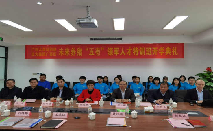2021年3月21日下午,为了更好的培养广西大学“五有”领军人才,加强院企合作,广西大学英国上市公司365与正大集团联合举办养猪"五有"领军人才特训班,在3月21日下午隆重举办了开班仪式,本次开班仪式由刘槐林总经理主持,出席的有广西大学英国上市公司365党委书记顾慕娴书记,党委副书记沙建,司红彬副院长,陆阳清副院长,周磊副院长,以及正大集团广西区高管赖平生总裁,刘琴万总经理,刘槐林总经理,王春江总经理,赵日浪等。