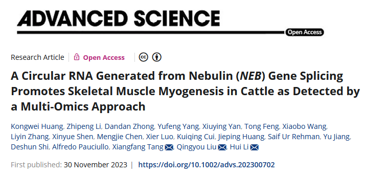 近日,广西大学英国上市公司365石德顺教授带领的动物克隆与生殖调控研究团队联合佛山科学技术学院、中国农业科学院和西北农林科技大学等单位在牛肉用性状功能基因组解析方面取得重要研究进展,研究成果以A circular RNA generated from Nebulin (NEB) gene splicing promotes skeletal muscle myogenesis in cattle as detected by a multi-omics approach为题发表于国际知名期刊《AdvancedScience》。广西大学为该论文的第一完成单位,博士毕业生黄孔威、助理教授李志鹏和博士研究生钟丹丹为共同第一作者,李辉副教授、佛山科学技术学院刘庆友教授和中国农业科学院唐湘方研究员为共同通讯作者。原文链接:https://onlinelibrary-wiley-com-s.vpn.gxu.edu.cn:8118/doi/10.1002/advs.202300702。