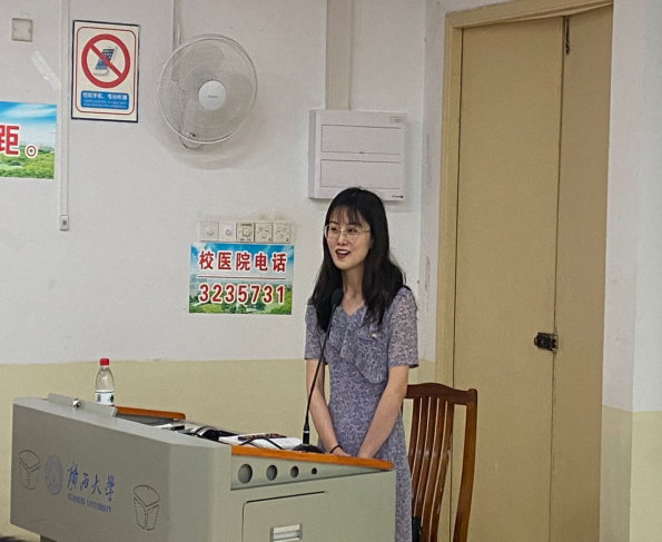 韦义荣同志作为考研、求职两手抓的同学代表,分享了她求职及考研复习两不误的心得,强调了大学初期制定好大学规划和目标的重要意义。韦义荣特别强调加入学生组织锻炼各方面能力、提高综合素质对于求职和升学的重要性,并详细介绍面试、签约等事宜。最后她向同学们寄语:“人生没有捷径,确立目标,严于律己,求学若渴,发挥优势才是成功的试金石。”