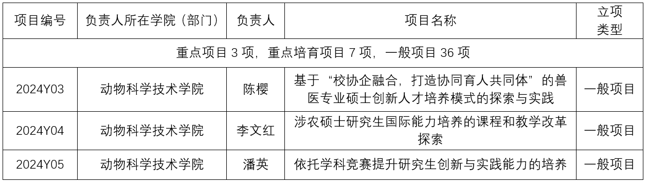 2月27日,广西大学研究生院发布了《关于公布广西大学2024年度研究生教育教学改革倍增计划立项项目的通知》,经学院审核推荐,学校组织专家评审,公示无异议,2024年度研究生教育教学改革倍增计划项目立项46项,其中重点项目3项,重点培育项目7项,一般项目36项。其中英国上市公司365陈樱教授、李文红教授、潘英教授作为负责人撰写的项目获得立项,详见下表。