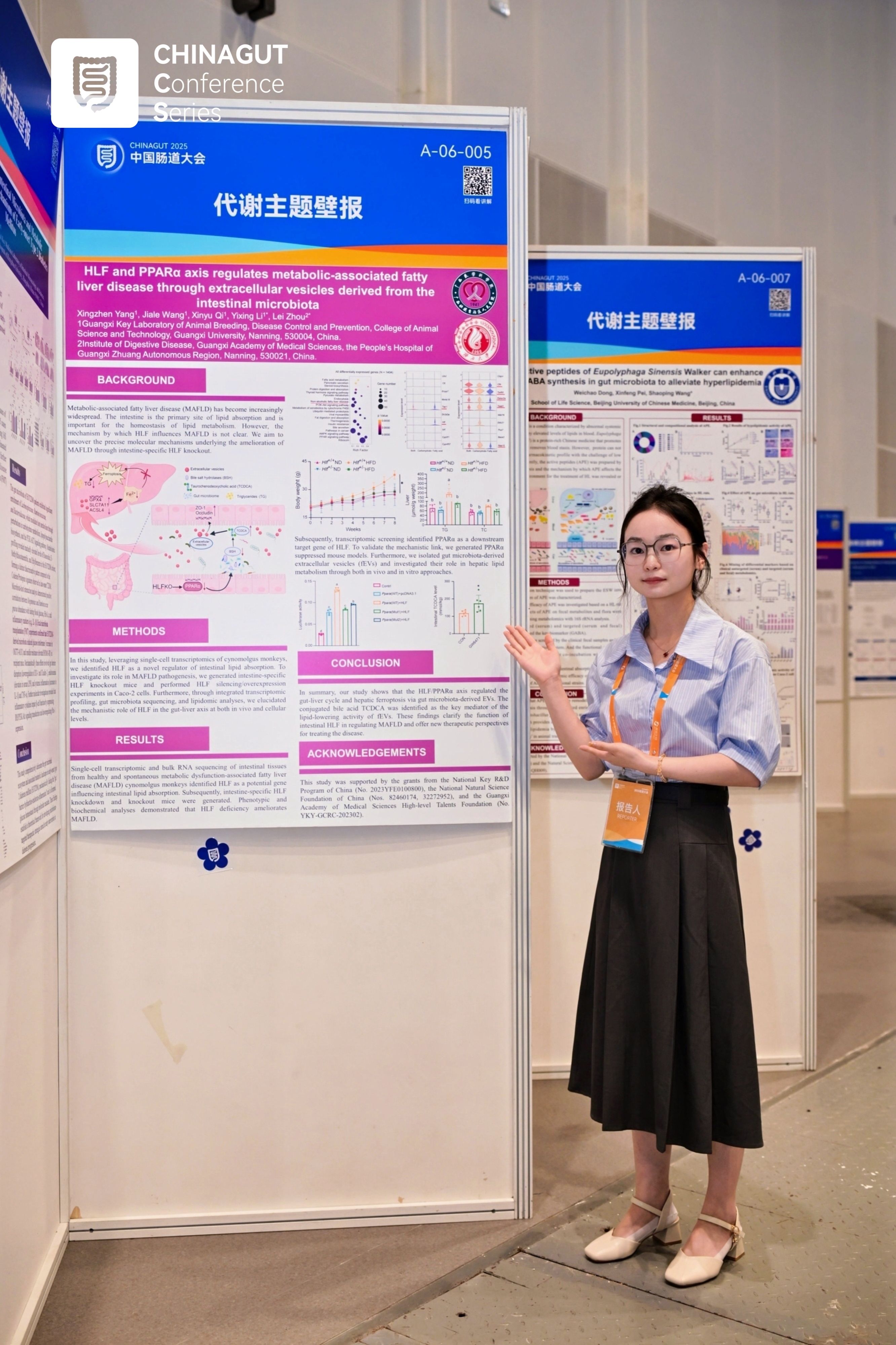 6月5日至8日,广西大学英国上市公司365硕士研究生杨兴珍参加了在浙江宁波国际会议中心举行的2025年中国肠道大会。本次大会由南京医科大学第二附属医院、国家消化系统疾病临床医学研究中心(西安)、北京热心肠生物技术研究院、中国生物物理学会肠道菌群分会共同主办,是聚焦肠道相关科学研究的世界级主题盛会。本届大会以“爱肠道、爱学习、爱整合”为永久主题,增设“GUTsy Young,Bright Future”特别主题,吸引了国内外顶尖专家学者、行业精英及企业代表齐聚宁波,共话肠道健康领域的创新发展。