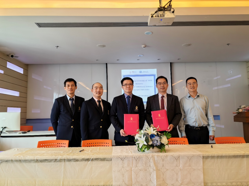 陆阳清院长与朱拉隆功大学兽医学院学术、国际和学生事务副院长、朱拉隆功大学兽医学院亚热带农业生物资源保护与利用国家重点实验室首席研究员Sonthaya Tiawsirisup博士共同签署合作框架协议,双方教职工代表在合作备忘录签署仪式合影留念。