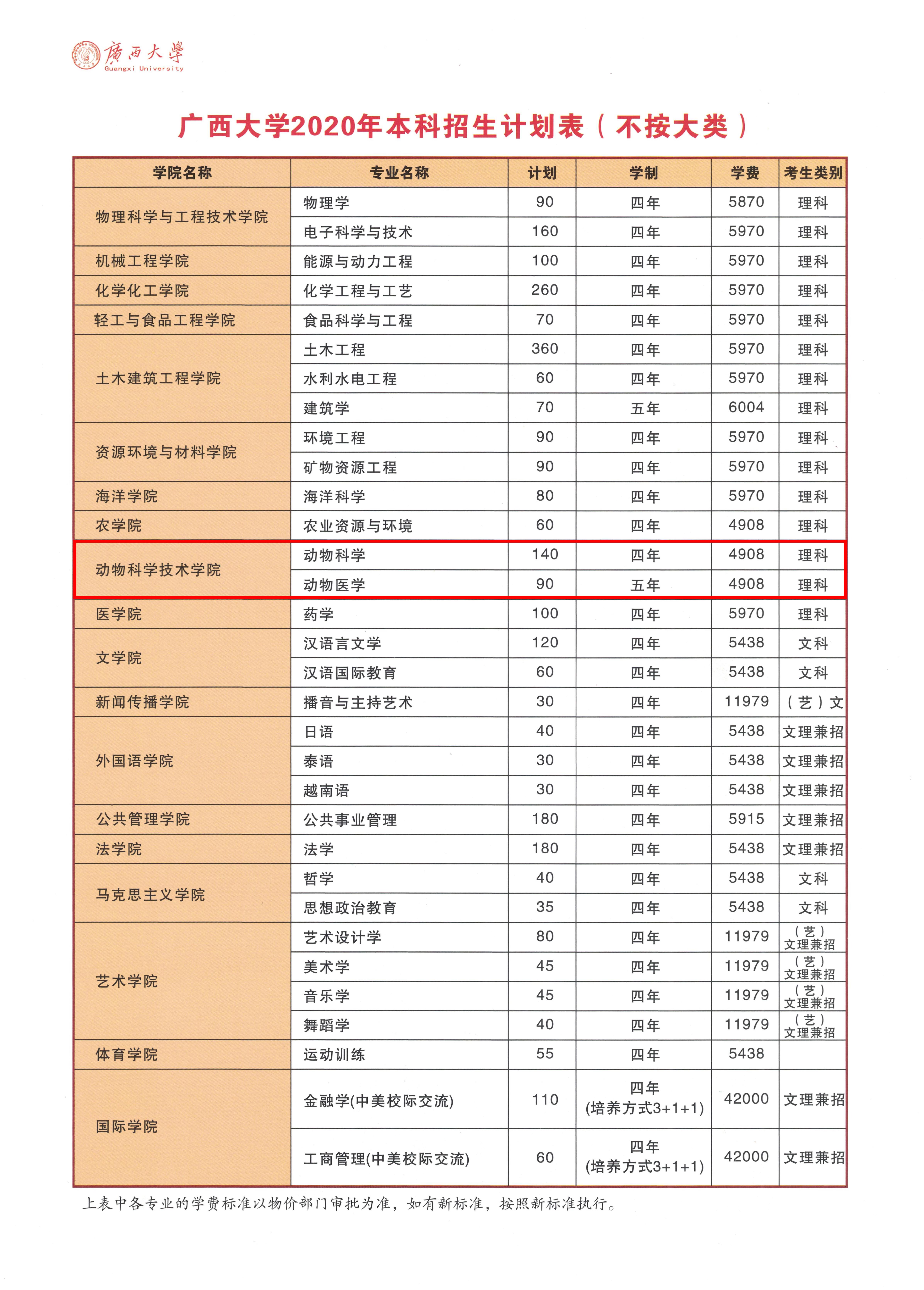 广西大学2020年本科招生计划表(不按大类)