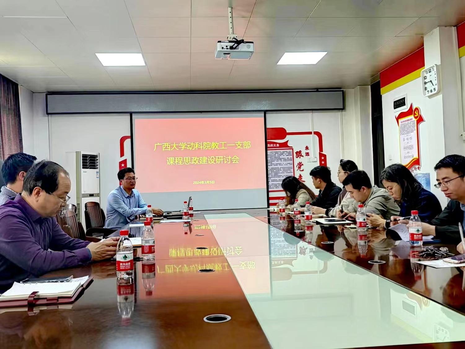 On the occasion of the two national sessions, in order to implement the fundamental task of cultivating morality and cultivating people, improve the ideological and political work system, improve teaching effectiveness and education quality, and break through the current difficulties of ideological and political education in colleges and universities, the First Party Branch of the Faculty and Staff of the College of Animal Science and Technology held a general meeting of all party members of the branch in the 302 conference room of the college on the afternoon of March 5 to discuss the construction of ideological and political courses. The meeting was chaired by Comrade Jiang Qinyang, secretary of the branch.